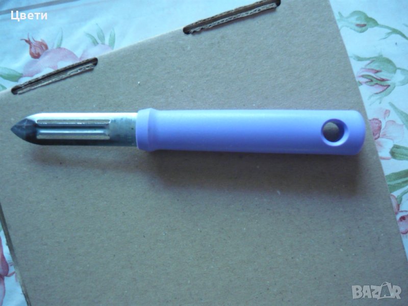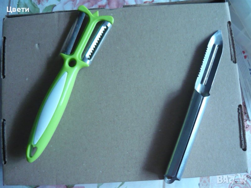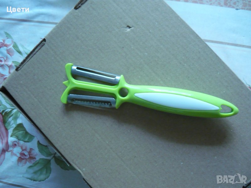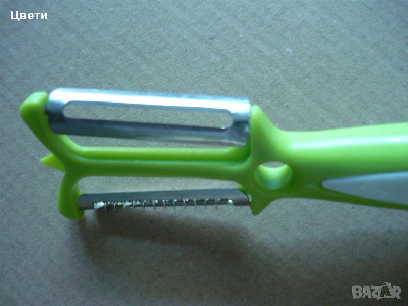 Една е с цвят зелен и бяло, е многофункционална - има 2 ножчета за белене и с нея може да се бели обикновено или релефно, но и да се реже на ленти. Ако тя се купи самостоятелно и отделно от другите предмети, ще има Цена - 2,50 лв.