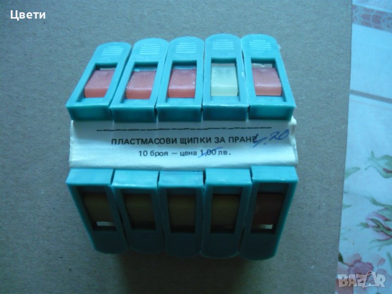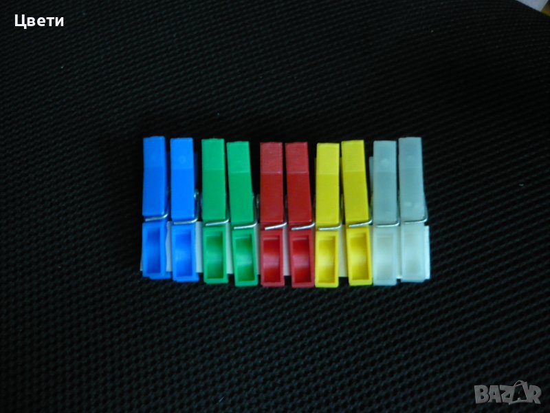 2 бр. Напълно нови неупотребявани комплекти от по 10 щипки. Едните с цвят зелен и много здраво защипване на дрехата за простиране - 0.45 лв. И другия комплект 5-ет цветни щипки 10 броя. Ако се купят самостоятелно и отделно от другите предмети Цената за всеки един комплект е 0.30 лв.