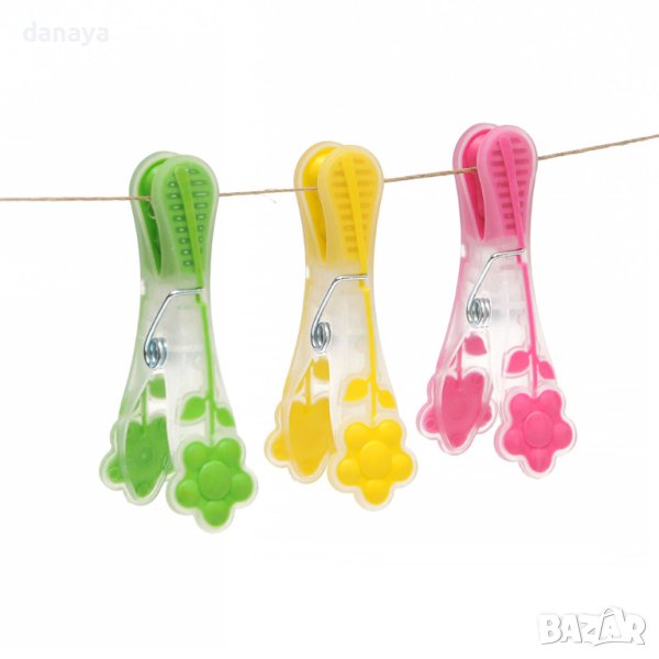 Комплект от 10 броя щипки за простиране с интересен и свеж дизайн на цветя. Здрава конструкция, подсилени със силикон. Щипки с широко у многофункционално приложение – може да се използват като щипки за закрепване на торбички със зърнени храни, чипс и др., както и за всякакви домашни и гаражни цели. Перфектни са за окачване на снимки, занаятчийски проекти и др. Супер удобни за използване.