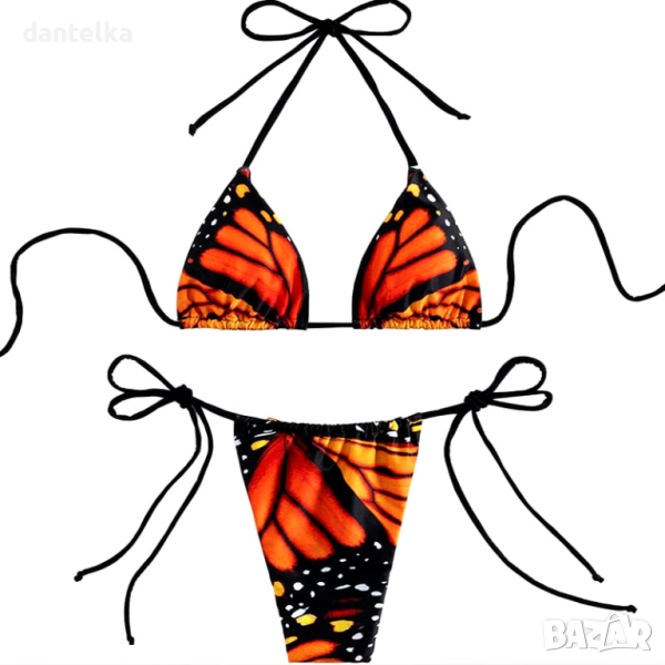 Бански за смели дами, горната част е с триъгълни чашки, с подплънки, с връзки на врата и гърба. Долнището е тип широка прашка.
