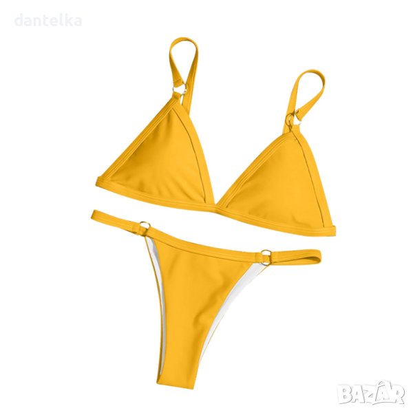 Бански костюм от две части с подплънка в свеж изпепеляващ жълт цвят, който ще подчертае още по-добре слънчевия загар.