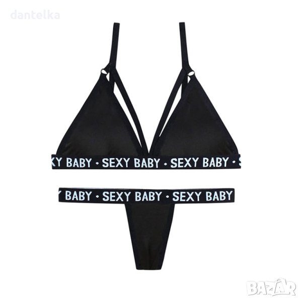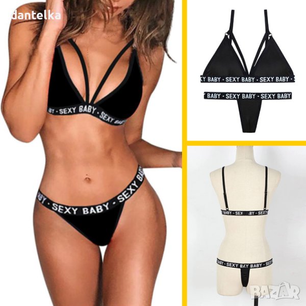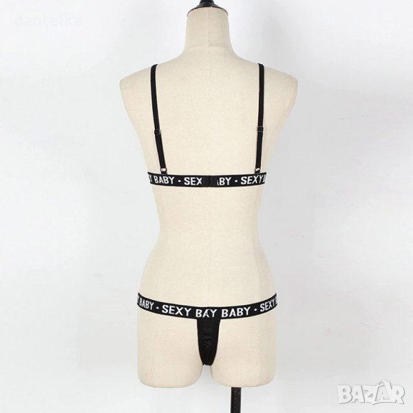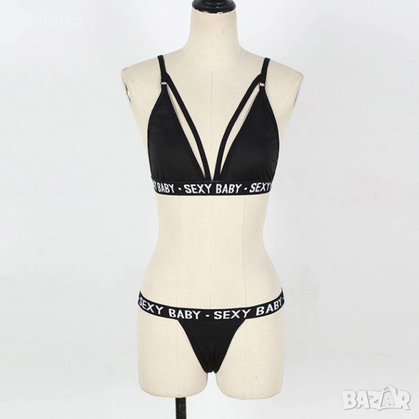 Изключително ефектен дамски бански костюм от две части, умело съчетаващ два контрастни цвята - класическо черно с бели закачливи надписи. Изработен е от качествена материя, която гарантира здравина и удобство, а декорацията от ластични елементи добавя сексапил и настроение на този секси бански костюм.