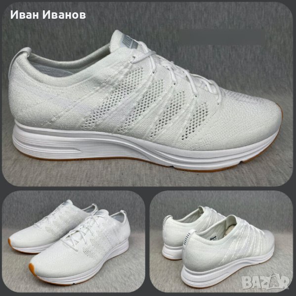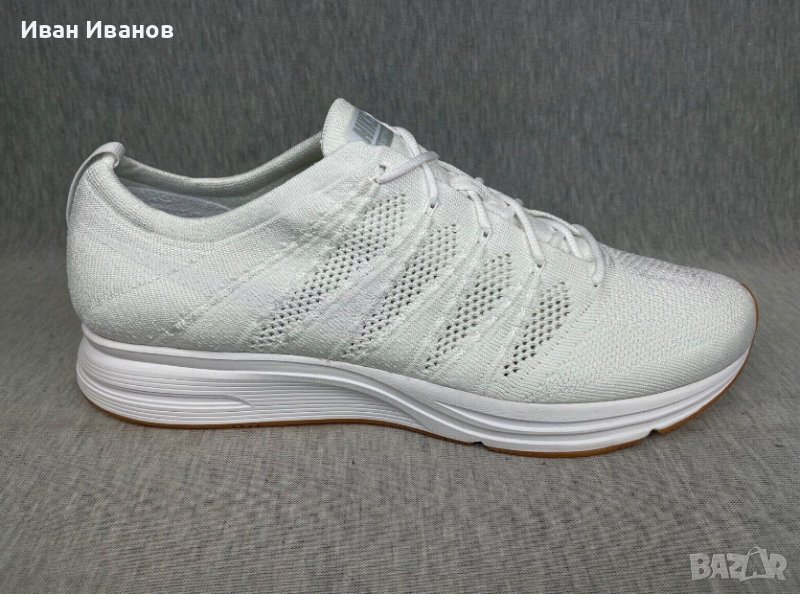 Цялата горна част от Flyknit на този чифт, включително акценти и брандиране, е изцяло в бяло. Контрастът на това смекчено издание идва от винаги ценената гумена подметка.