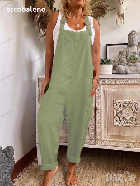 Дамски гащеризон с джобове от памук и лен с регулируема катарама, 3цвята