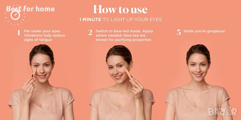 Докоснете и отидете: Толкова е лесно за използване. Просто плъзнете бутона в режим на вибрация и потупвайте върха за 1 минута под всяко око за ефект против умора. След това плъзнете в светъл режим и докоснете директно всички петна