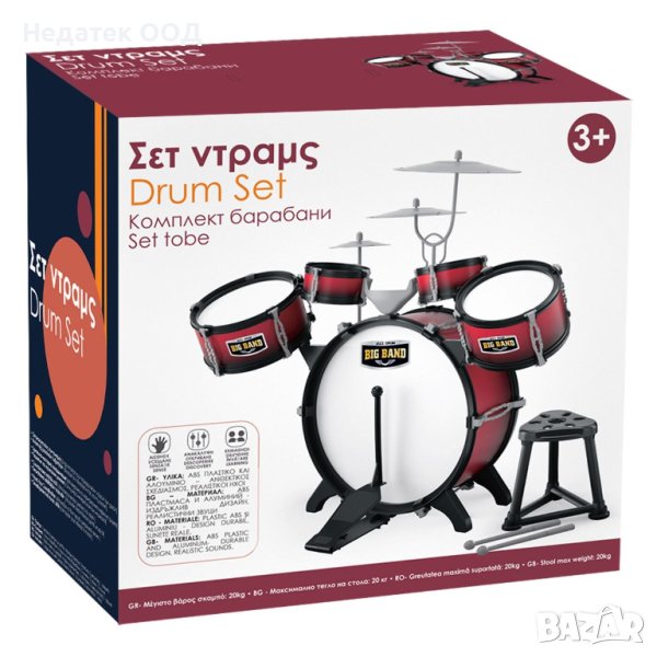 Комплект барабани с 1 голям барабан 33.5x19cm, 2 средни (19.5x10.5cm, 16x10cm) 2 малки (11.5x5.5cm), 2 чинела, палки и табуретка. Изработен от ABS пластмаса и алуминий, има издръжлива рамка и реалистични звуци.