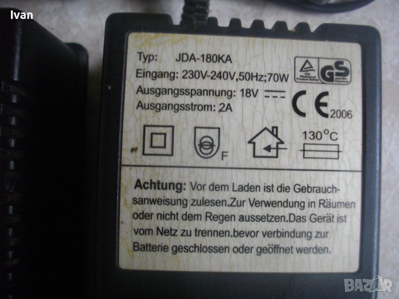 ОПИСАНИЕ зарядно 18 волта - за закръглени никел-кадмиий батерии всякакви. Цена 99 лв. Волтаж - 18 волта, 2,0 ампера, 70 вата, 2 светлинни индикации. Type JDA - 180 KA. Немско оригинално. Почти ново. Отлично техническо/работно състояние. Зарежда без да затопля зарядното.