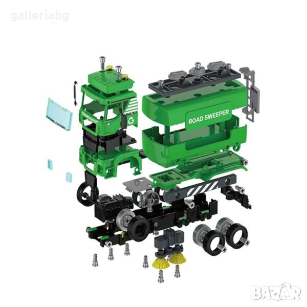 Камион за почистване на пътища със светлина и звук + 100 части и включени отвертки за сглобяване и разглобяване.