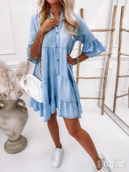 Дамска едноцветна дънкова рокля с половин ръкав с модерен стил и мека и удобна материя. Независимо дали е ежедневие, излизане, ваканция и т.н., може да се носи на машина или на ръка. Материята е устойчива на намачкване и на начупване. Размерът се измерва на ръка, като е нормално да има грешка от 1-3см.