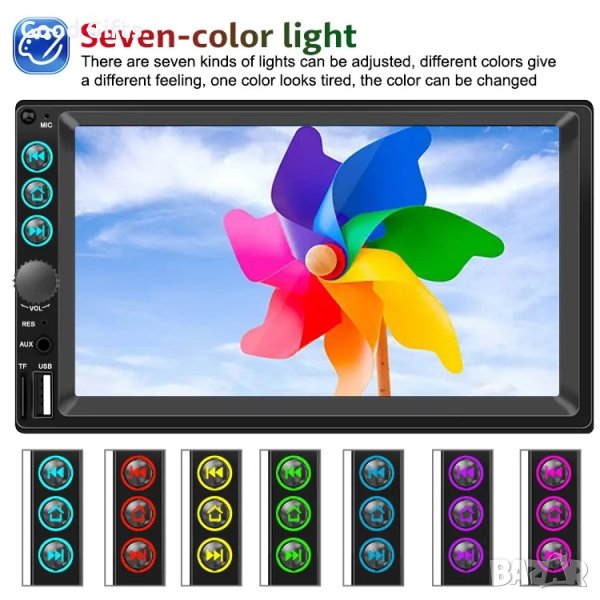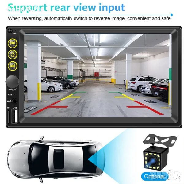 Автомобилен MP3 MP4 MP5 AVI PLAYER с BLUETOOTH и 7 инча touch screen 2 DIN дисплей, FM цифров тунер, AUX стерео вход 3,5mm, RCA видео вход, RCA аудио-видео изход. Възпроизвежда файлове от microSD /TF/ CARD и USB FLASH DRIVE. Мощност 4x50W. Захранване 12VDC.