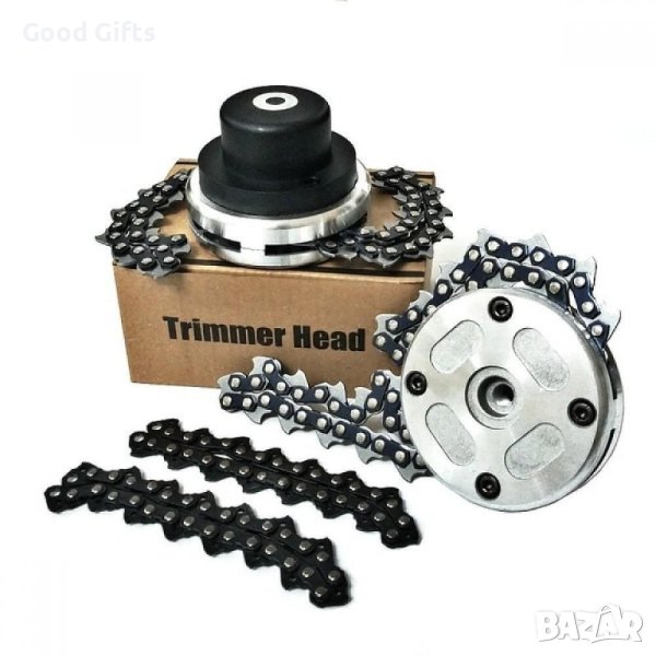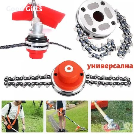 Универсалната глава за тример, прави машината по-мощна и функционална. Нейният диаметър и начин на инсталиране позволява да се използва с бензиновите тримери на различни производители. Верижната приставка, заместваща стандартната корда, е практически вечна. Не се нуждае от подмяна и периодично може да се заточва. С нея лесно ще режете храсти, дебели бурени и всякаква трудна за почистване растителност.