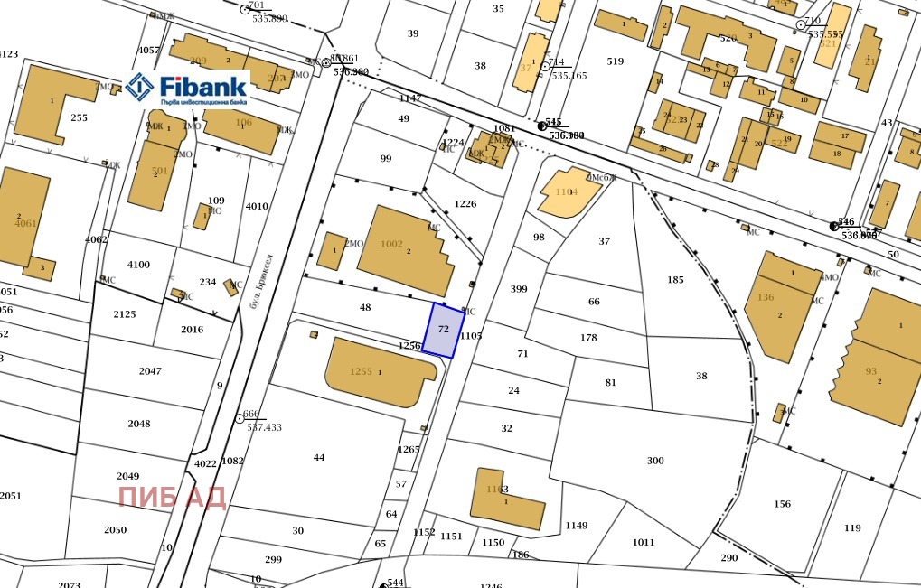 Поземлен имот с идентификатор 68134.1503.72 площ съгласно кадастралната карта от 678 кв.м. , а по одобрен ПУП с площ от 469 кв.м. Регулацията не е приложена.