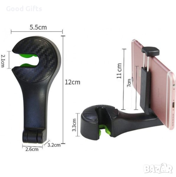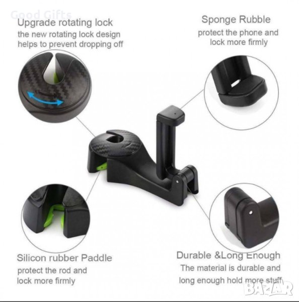 Многофункционален автомобилен аксесоар, съчетаващ в себе си поставка за телефон и закачалка за багаж. Сложете ред на пазарските чанти и ги закачете на удобната кука, която се прикрепва към подглавниците на предните седалки и издържа до 4 кг.