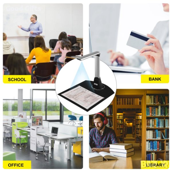 - ШИРОКИ ИЗПОЛЗВАНИЯ - Технологията за безконтактно сканиране се използва за увеличаване на видовете документи или обекти, които могат да бъдат сканирани. Тази камера за документи за онлайн обучение е подходяща за файлове с различни размери и форми или файлове в папки и може да разпознава 1-D или 2-D баркодове.Този преносим скенер може да сканира документи, лични карти, паспорти, книги, списания, баркодове и др., широко използвани в училища, библиотеки, банки, офиси и други места.