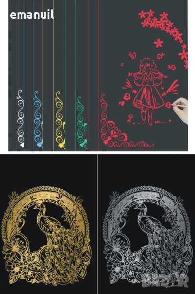 Скреч хартията има черно покритие което може ръчно да се изтрива-рисува с остър предмет или лазерно да се гравира.