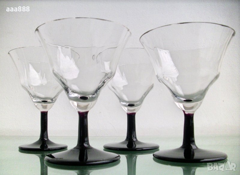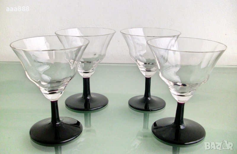 Комплект 4 броя тънкостенни кристални чаши за десертно вино, ликьор. Чашите са с елегантна визия, с оребряване, което придава ефектен оптичен ефект и ниско столче от наситено черен кристал. Обща височина 10 см, диаметър горе 8 см, вместимост 120 мл.