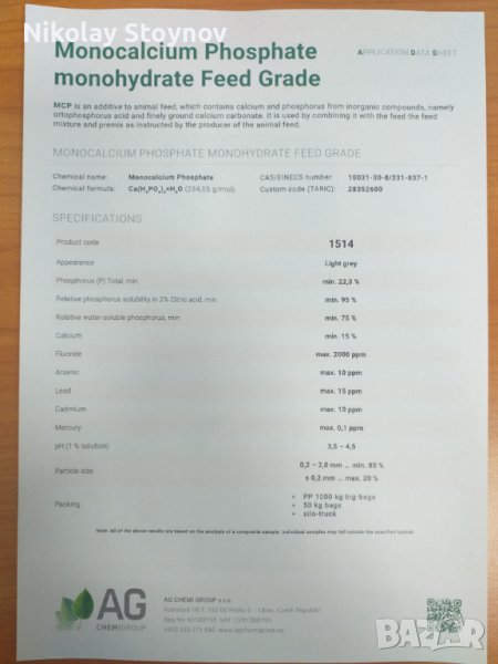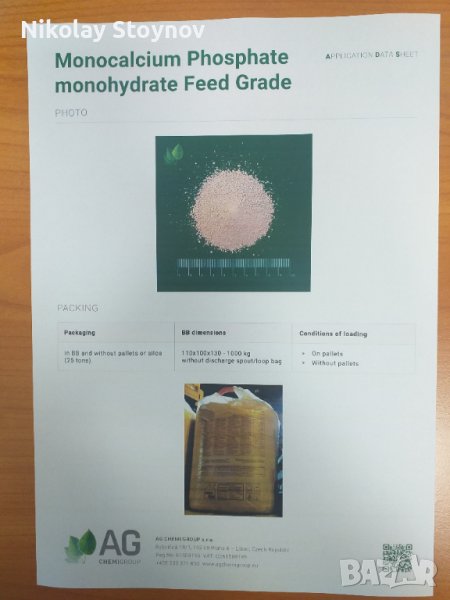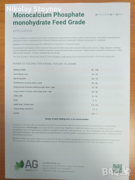 Имам удоволствието да Ви предложа изключително качествен фуражен монокалциев фосфат. Монокалциевия фосфат е фуражна суровина, която се произвежда от обезфлоурена фосфорна киселина и минерален източник на калций. Носител е на фосфор 22% и калции 16%.