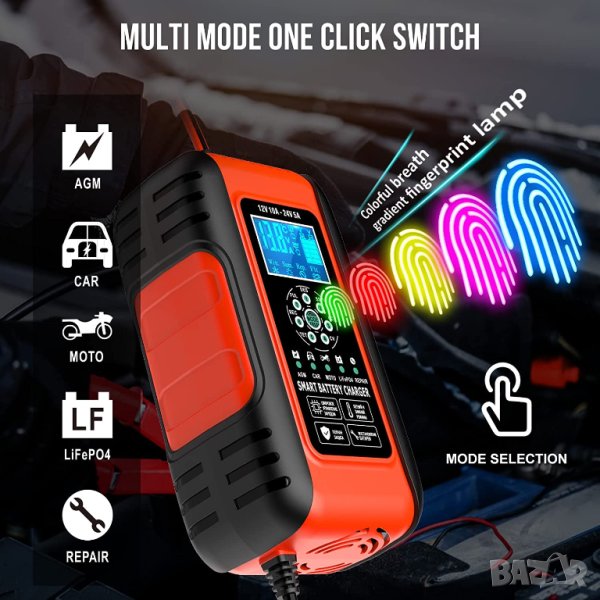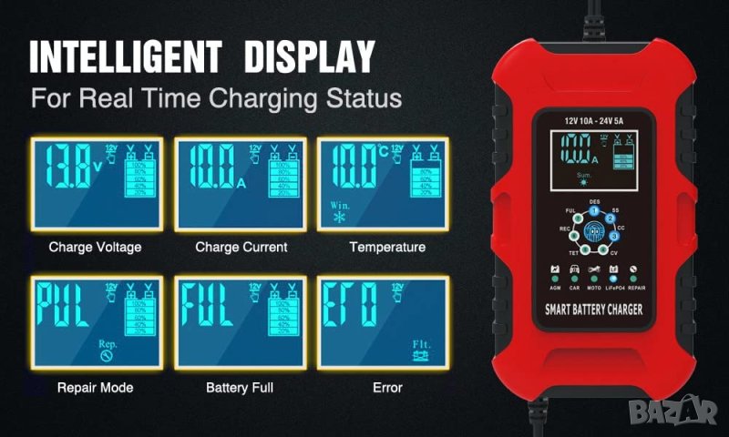 Многостепенно универсално умно зарядно устройство за различни видове акумулатори на 10А 12V или 5А 24V - Тягов, AGM, GEL, VRLA, EFB, мокри, стартови, калциеви и др. Максимален заряден ток на 12V - 10A, на 24V - 5A.