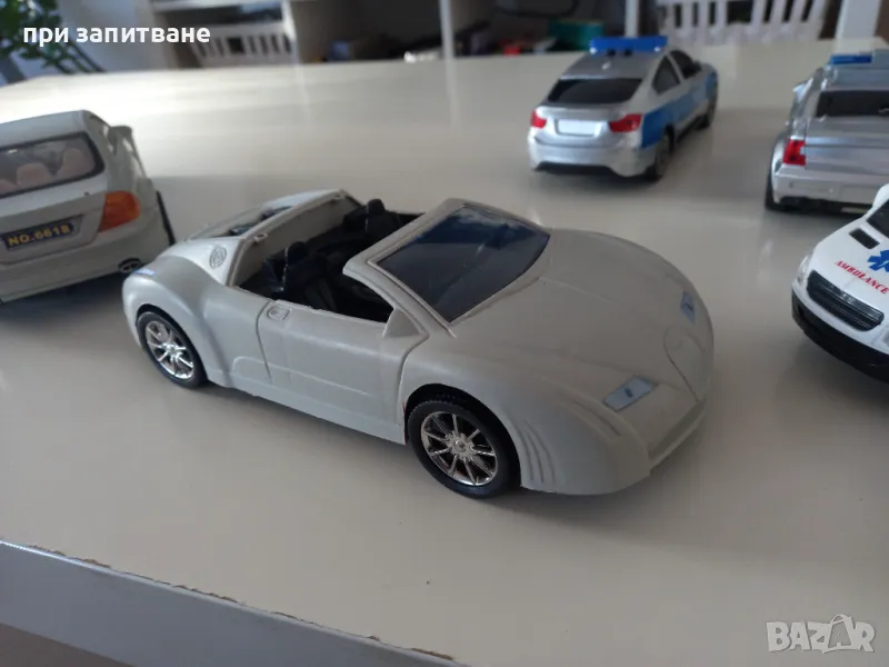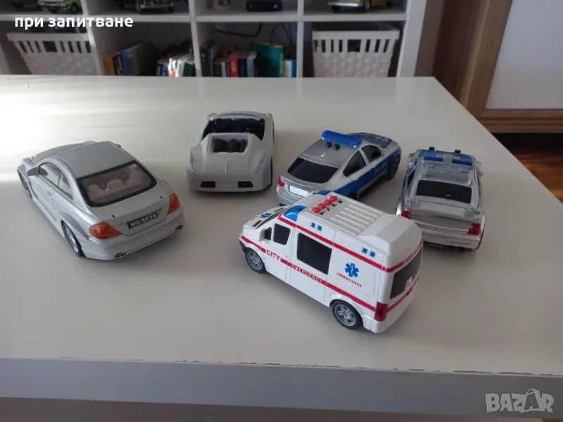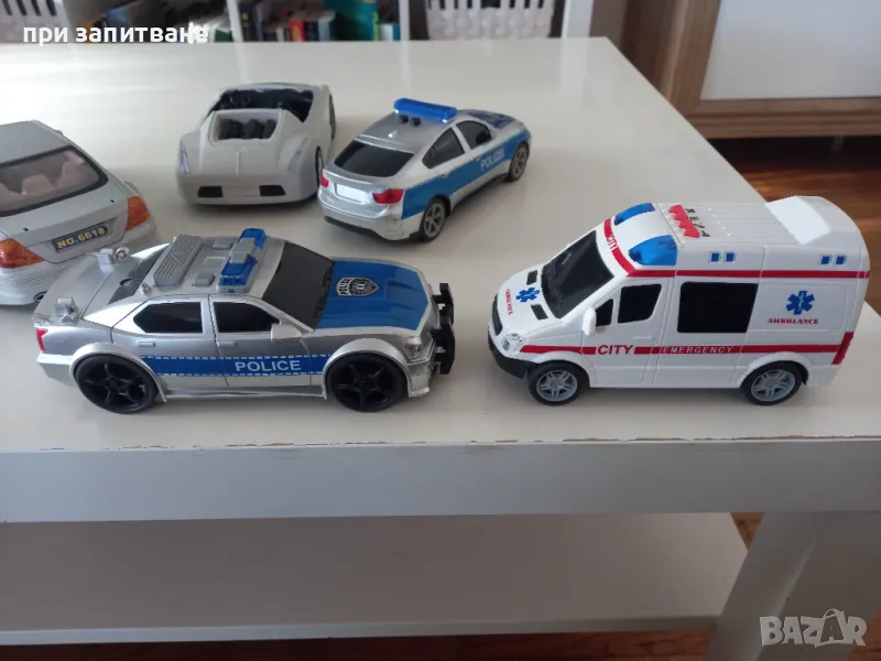 Пластмасови полиция BMW и американска кола, линейка. Имат сигнализация при натискане на бутоните на тавана, но батериите им са за смяна. Имат фрикционен механизъм. BMW е с дължина 20,5 см., американската / отваря и се багажника при натискане на бутон на тавана/- 19,5 см., линейка- 16 см. BMW- цена 9 лв. Американската полиция и Линейката - 8 лв. за играчка.