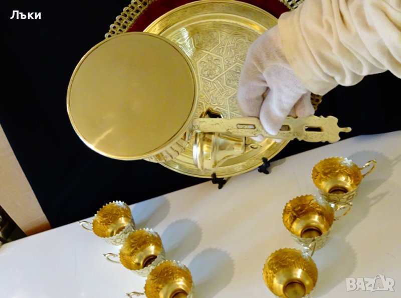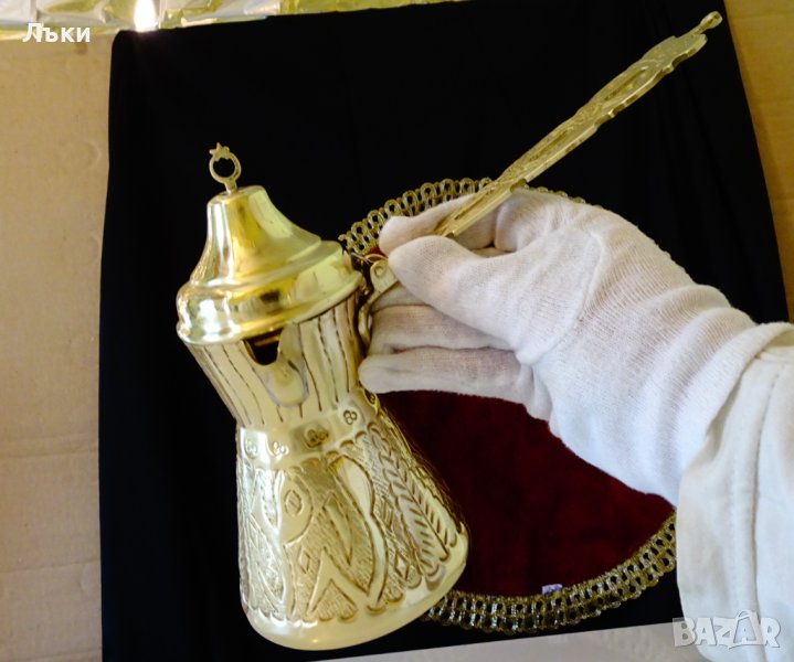 ракия,чайник,ибрик,майсторска ръчна изработка от високо качествен златен бронз.Декорирано с релефно ковани орнаменти и арабска калиграфия.Дръжката на капака представлява