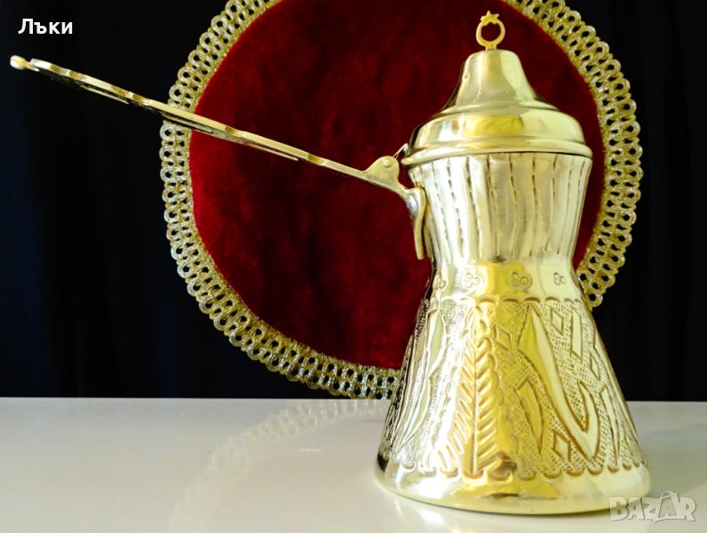 полумесец със звезда.Дръжката на джезвето е отлята от масивен бронз,красиво гравирана с флорални мотиви и подпис на майстора.Височина 18 см.,диаметър на дъното 10 см.,дължина на дръжката 17.5 см.Тегло 270 гр.Вместимост 500 мл.