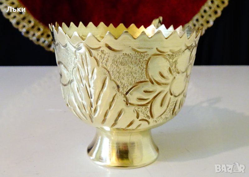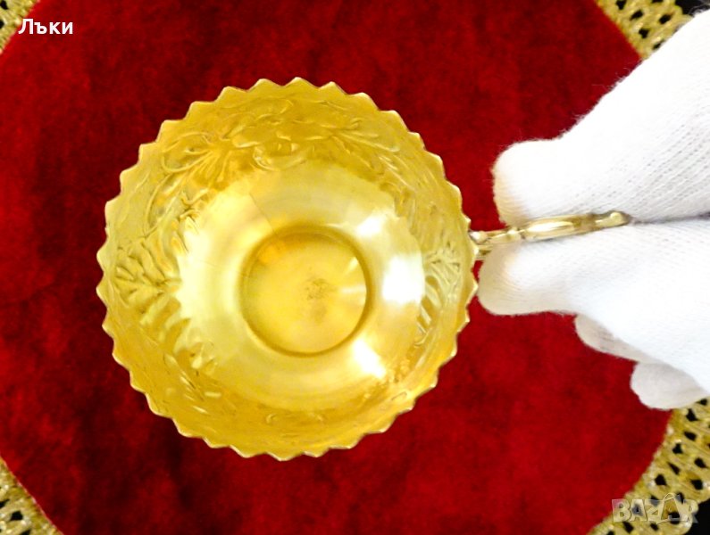 от високо качествен златен месинг.Имат ефектен дизайн с повдигнато дъно,приказна декорация от релефно ковани цветя,орнаменти и нежна извита дръжка.Височина 6 см.,диаметър 6 см.,тегло на всяка 50 гр.Вместимост 120 мл.Налични 6 броя,цена 15 лв.,за брой.