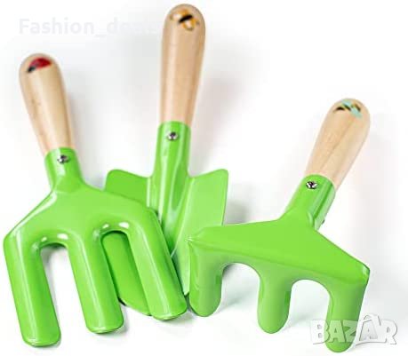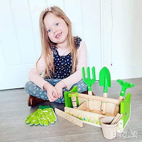 11 части за игра, включително градински ръкавици, линийка, мистрия, вилица, гребло и градинска кутия, специално проектирани за малки ръчички.