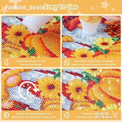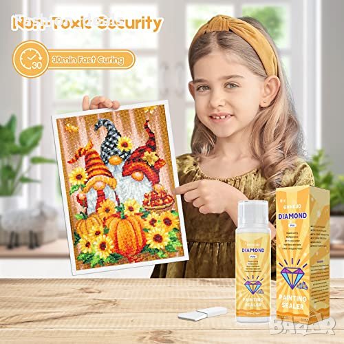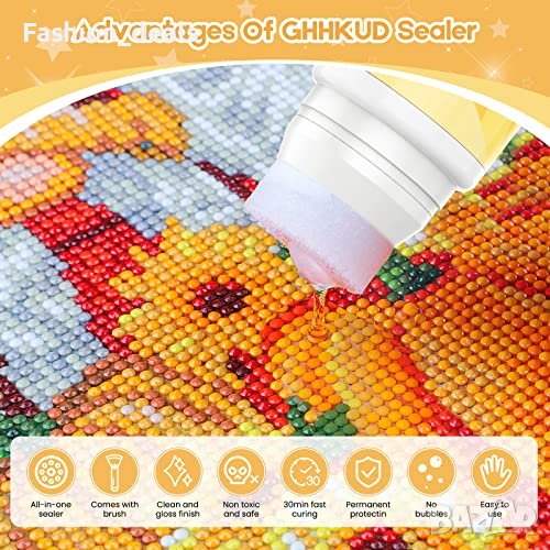 Универсалният дизайн на запечатващия материал разполага с апликатор с глава на гъба, което улеснява равномерното нанасяне на лепилото върху повърхността на диамантената картина