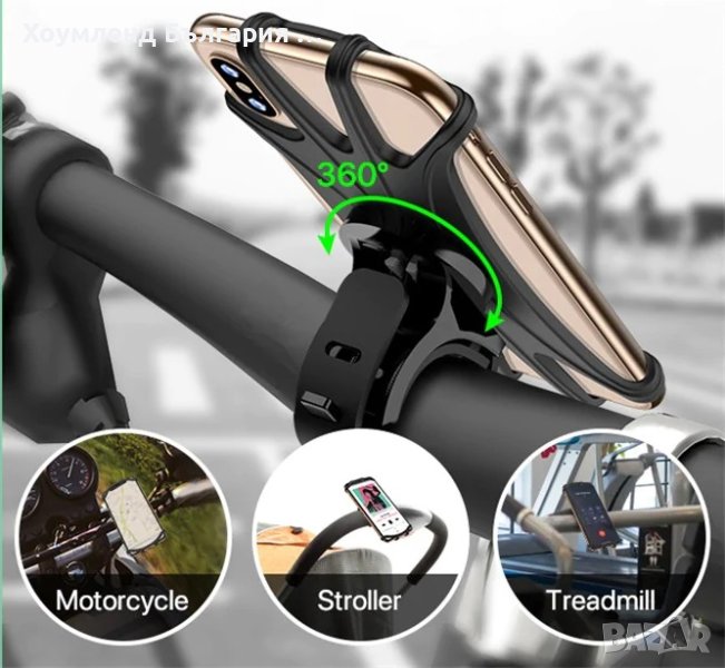 Стабилна гумирана стойка за захващане на смартфон към велосипед или мотор. Притежава разтегателни силиконови ушички, който захващат телефона БЕЗ да пречат на камера, бутони и букси.