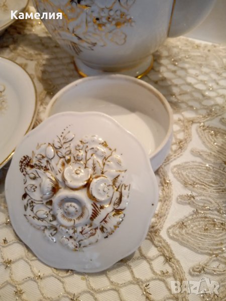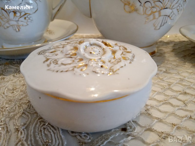 порцелан "Златен букет" отЛФЗ е шедьовър на стила Сталински Аmpir в порцелана и по-специално - в съдовете. Автор на формата е известният Kриммер. Началото на петдесетте, след войната. Релефен порцелан ръчно рисуван със злато. Маркировка на 4 елемента (с изключение на кутията), ВНЕ ГР, което означава най-висока форма на сложност. Малко са направени такива порцелани и още по-малко са оцелели до наши дни. Релефна шарка от двете страни. Без забележки.