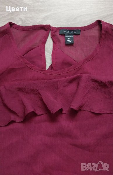 Блузата бордо по етикет е XS, но е малко по-широка, с голи рамене е както се вижда от снимката - 10лв