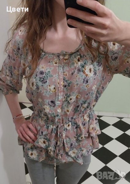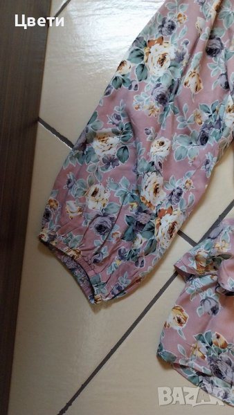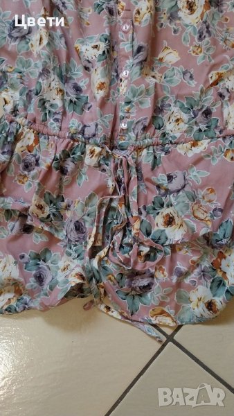 Ризката на цветята е S размер, има връзка на талията и ластик на ръкавите- 10лв