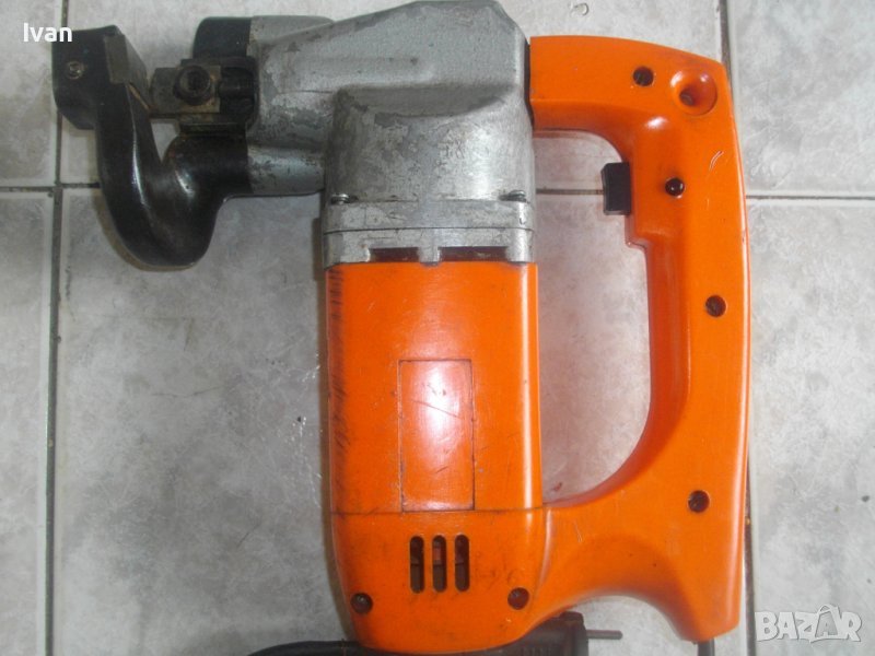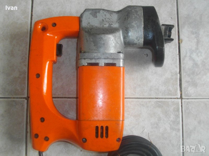 ОПИСАНИЕ на електрическа ножица. Руско/СССР производство - т втора половина на 80-те години. Липсва фабрчният стикер. Ножицата реже ламарина с голяма дебелина - 0,5 мм до 2,5 -3 мм. Предполагам модела на машината е ИЭ 5403У2 с характеристики: мощност 400 вата, 990 об/мин. Рязне до 2,5- 3 мм. S3 - 40 %л 1.9 Ампера защита. Ножицата е масивна, от дебела стомана глава и корпус от твърда пластмаса, оранжев цвят, характерен за руските професионални машини от онова време. И двата ножа на машината са в отлично състояние - почти нови, без наранявания. От дебела 8 мм инструментална стомана са. Автостоп на спусъка. Размери на ножицата - 265 х 280 х 65 мм. Тегло на ножицата - 5,0 кг.