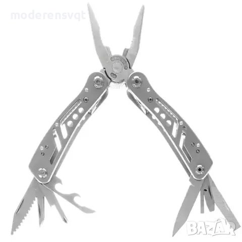 Мултитулът идва с нож, трион, клещи, отварачка за бутилки, отварачка за консерви, отвертка, джобно ножче, клещи, нож и много други.