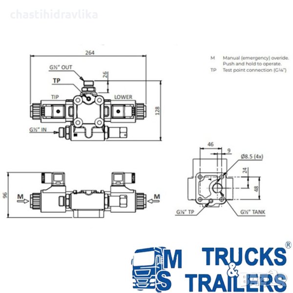 Хидравличен разпределител за монтаж на шасито или на резервоара - 24V с краен изключвател