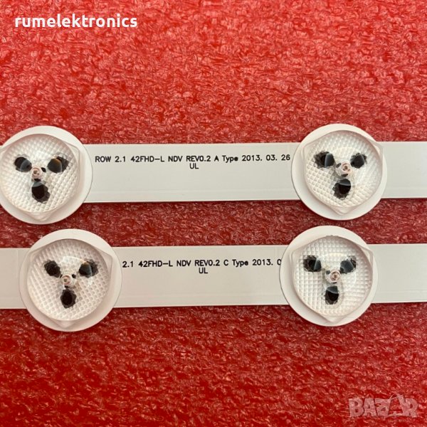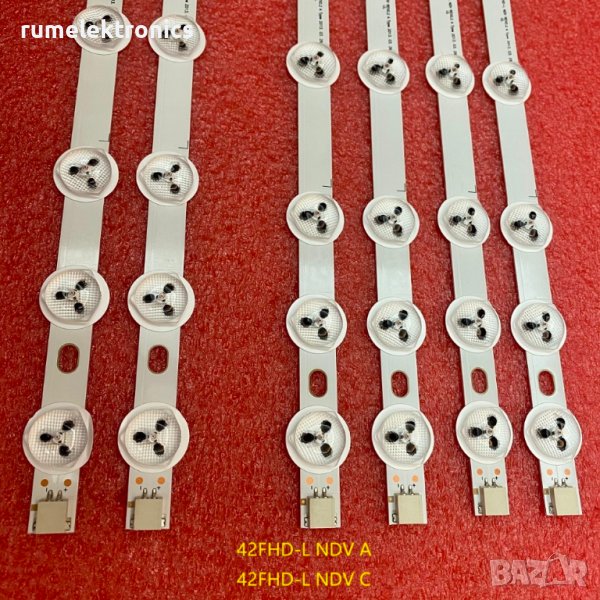 Цената е за комплект ленти 4бр. 42FHD-L NDV REV0.2 A-TYPE, 374мм, 8 светодиода, 3V и 2бр. 42FHD-L NDV REV0.2 C-TYPE, 374мм, 8 светодиода, 3V.