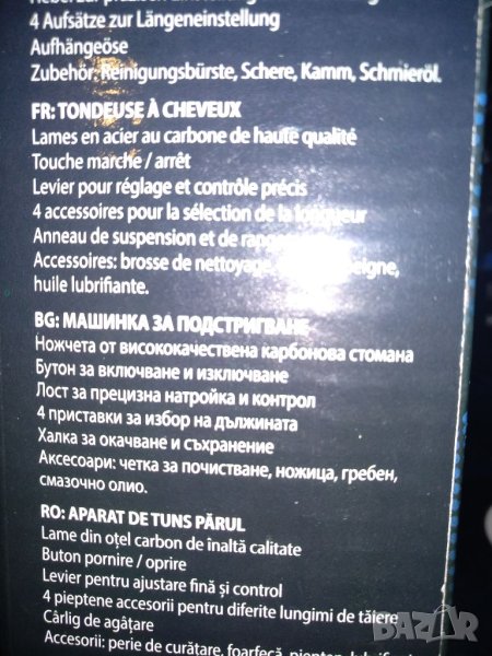 Машинка за подстригване с ножчета от висококачествена карбонова стомана. Бутон за включване и изключване. Лост за прецизна настройка и контрол. 4 приставки за избор на дължината на косъма. Халка за окачване и съхранениe. Аксесоари: четка за почистване, ножица, гребенче, смазочно олио 10W, 220-240V, 50-60HzИзпращам с Еконт или лично за Сф.