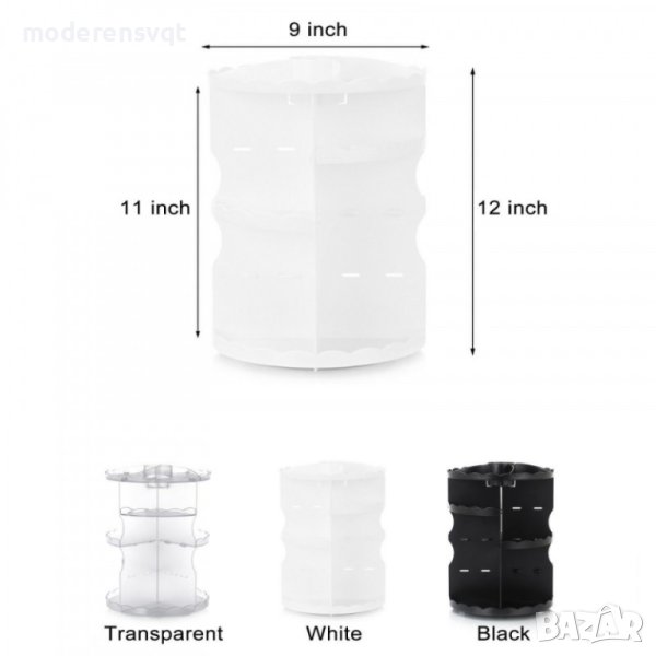 Всяка дама, която се гримира и носи бижута желае те да бъдат съхранявани на удобно и красиво място, до което тя да има лесен и бърз достъп. Ние Ви предлагаме един чудесен продукт за това – органайзер за бижута и гримове, въртящ се на 360 градуса, направен от пластмаса. Този луксозен предмет има различни по големина отделения, чиято височина може да се регулира в зависимост от желанието Ви.