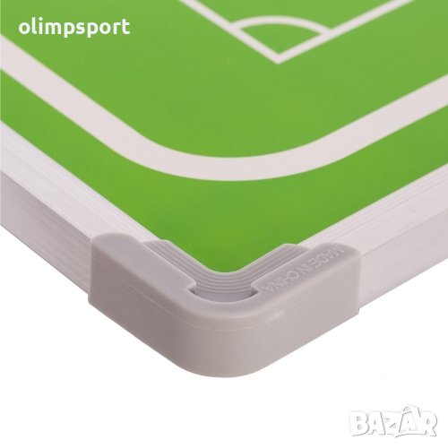 Треньорска магнитна дъска за футбол с размери 80х60 см. Подходяща за учители и треньори по време на тренировки и мачове. За нагледно представяне на тактиката, съставяне на стратегия за защита или нападение на отбора и за разпределяне на играчите по терена. От едната страна има схема на цяло футболно игрище, а от другата – на половин терен в по-едър мащаб. Комплектът съдържа 26 магнитчета (с номера от 1 до 11 на играчите от 2 отбора, трима рефери и топка), пет маркера за бяла дъска и гъба за изтриване. Дъската разполага с куки за окачане. Размери дъска - 80х60 см. Материал - метал, PVC, картон. Дължина маркер - 11.5 см. Размери магнит - Ф2 см х 0.6 см. Тегло нето за комплект – 1.7 кг. Тегло бруто за комплект – 2.5 кг. Размери кутия – 88х63х3 см.