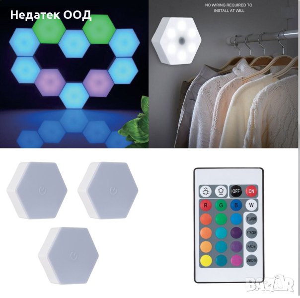 Стенни бели плочки, led с дистанционно управление с ON/OFF и избор от различни цветове. Работи с 3 батерии AAA (не са включени). Дистанционното управление работи с една батерия тип CR2025-2032 (включена). Разполага с 3 пластмасови основи със стикери, които се захващат на гърба на всяка лампа с възможност за съединяване.