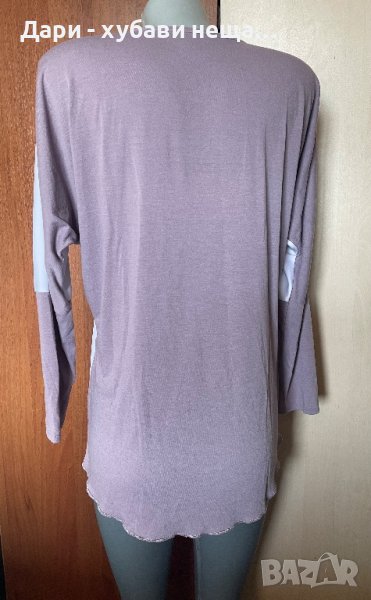 Блузата е в отлично състояние!Еластична материя в бяло и пепел от рози.При по-ниска фигура може да се носи и като туника.Кройката на ръкава позволява едър бюст.Подходяща е в съчетание с най-различни дрехи.