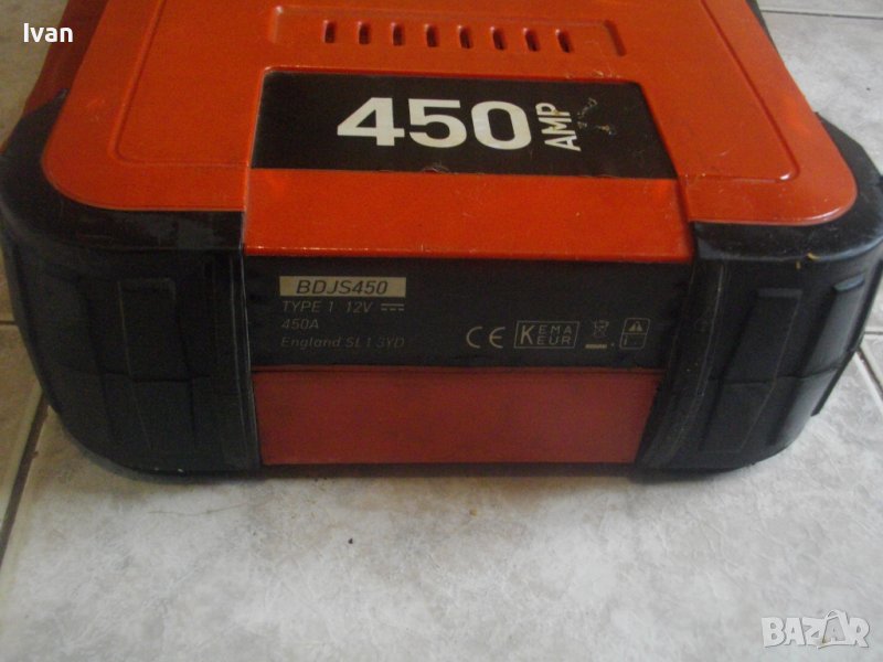 Стартиращо устройство 450 ампера - описание. Почти ново, с много запазен външен вид и техн.състояние - не тръгва зареждане. Марка и модел - Black Decker BDJS 450. Производство - оригинално Англия, упоменато на маркировките - England. Вграден силен прожектор.Вградена светлинна индикация при зареждане и ниво заряд акумулатор.