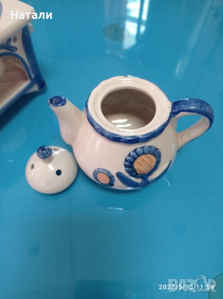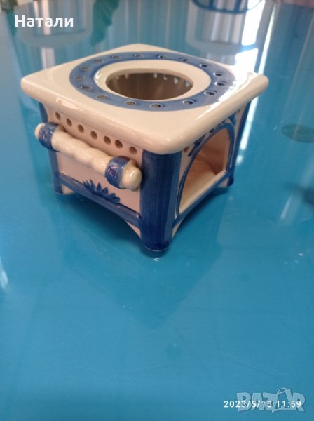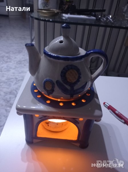 Керамичен немски дифузер за свещ.Много ефектно.Размер на чайничето височина 10см.,на съда 10см./10см.Без забележки.