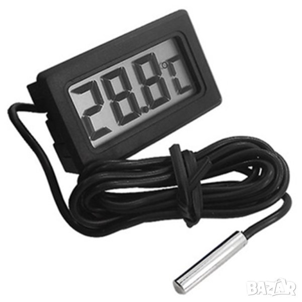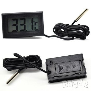 Този цифров термометър с външна сонда е подходящ за автомобили, хладилници, хладилни чанти, климатици, аквариуми и други. Подходящ за вграждане в предварително изрязани отвори. Захваща се лесно благодарение на щифтове от двата му края. Може лесно да разчетете стойностите и от по-голямо разстояние благодарение на големият цифров дисплей. Дигитален термометър със сонда чудесен за Вашия дом или автомобил. Лесно може да бъде монтиран в купето на автомобила и след изваждане на датчика отвън да контролирате външната температура. Удачен избор за вграждане в тенджери или казани за озахаряване, както и за контрол на температурата на ферментация или съхранение. Помага Ви да измервате температурата в стаята, на хладилната камера, на тялото си, да контролирате температурата на аквариума, потапяйки в него датчика, който е водоустойчив. Много практичен термометър, който дава възможност да измервате точно температурата, както навън така и в закрити помещения.