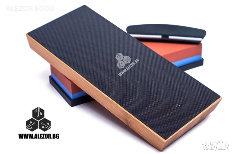 За фино или основно заточване на ножове, длета и други режещи инструменти предлагаме двулицев воден камък с различна едрина на абразива. Комплектът включва силиконова подложка, дървена стойка и пластмасова ръкохватка за захващане на острието под ъгъл при заточване.