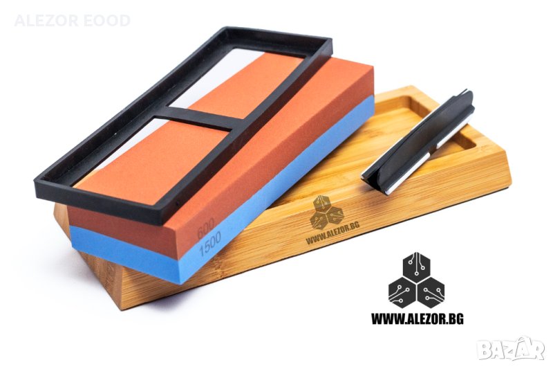 За фино или основно заточване на ножове, длета и други режещи инструменти предлагаме двулицев воден камък с различна едрина на абразива. Комплектът включва силиконова подложка, дървена стойка и пластмасова ръкохватка за захващане на острието под ъгъл при заточване.
