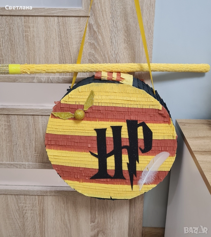 Пинята на тема Хари Потър по поръчка с включена пръчка за разбиване. Изработваме пиняти и тематични декори на всякаква тема по идея и снимка на клиента
