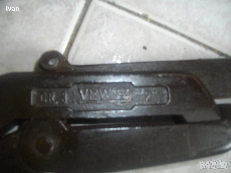 ОПИСАНИЕ на голям раздвижен гаечен ключ /чешмеджийски, водопроводен/ - черен - 159 лв.ОПИСАНИЕ на гаечен раздвижен водопроводен чешмеджийски ключ - 159 лв. Немски професионален, старо качество. Висок клас. Материал - закалена инструментална стомана. Марка и маркировки - VBW GR 3 2". Захват на челюстите до 2 цола. Отваряне на челюстите - 85 мм. Зъбите са с добро назъбване, без захаляване и чез нараняване. Цялостна дължина на инструмента в затворено състояние - 570 мм. Странична дебелина на ключа - 30 мм. Тегло - 3,0 кг. Цена - 159 лв.