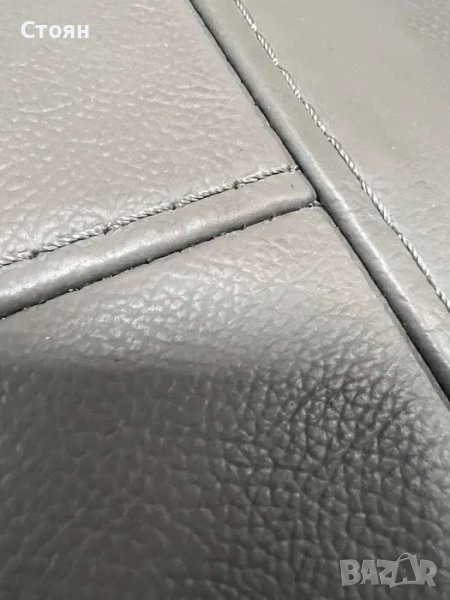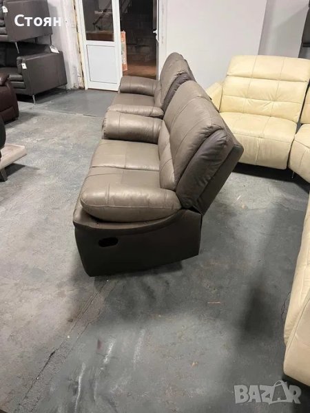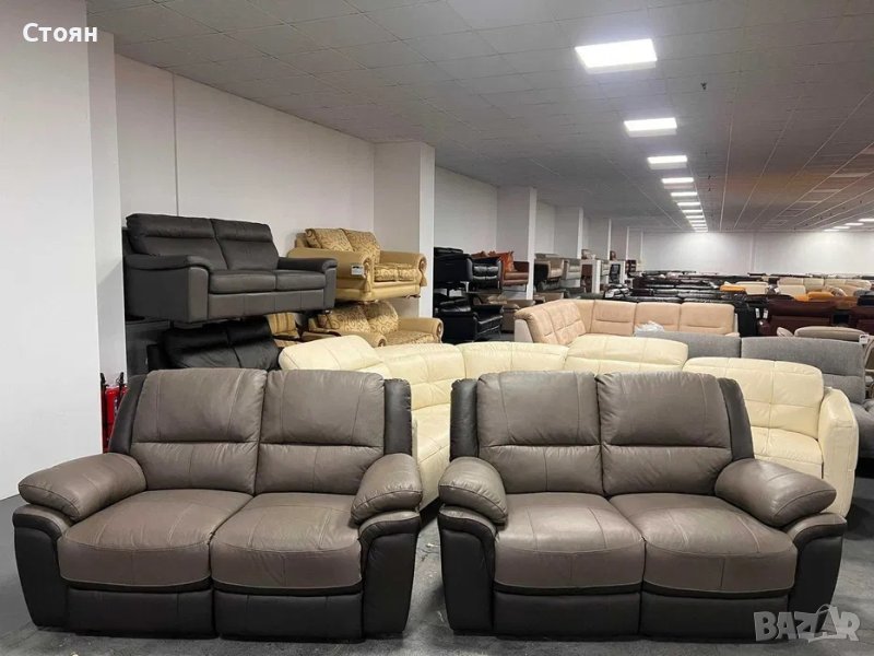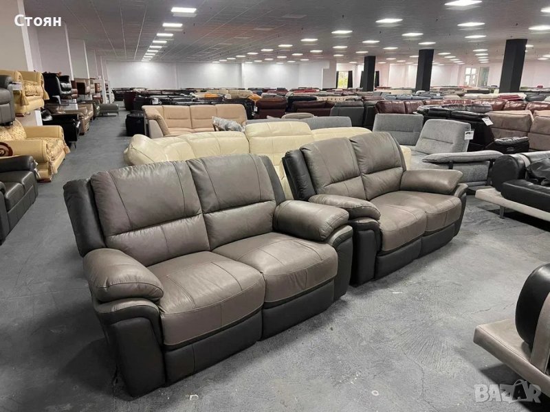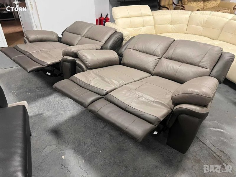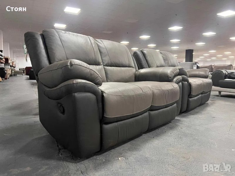 Двуцветни сиви кожени дивани "Pluto" две двойки с ръчен релаксиращ механизъм за краката в отлично състояние.