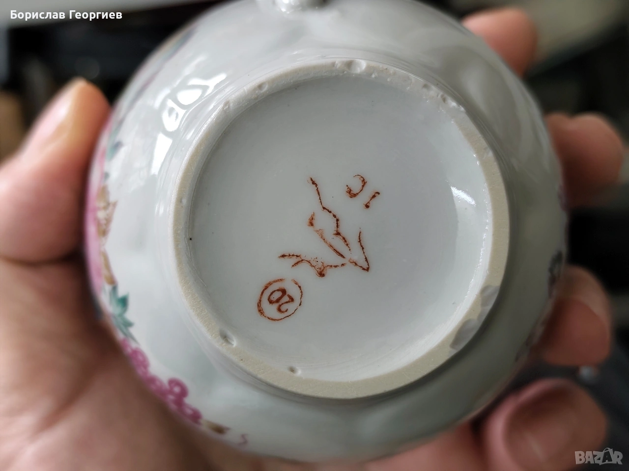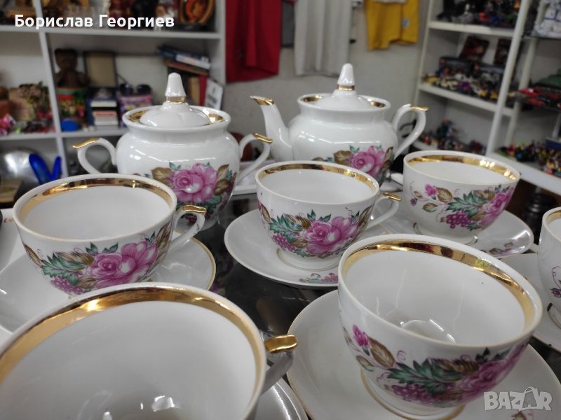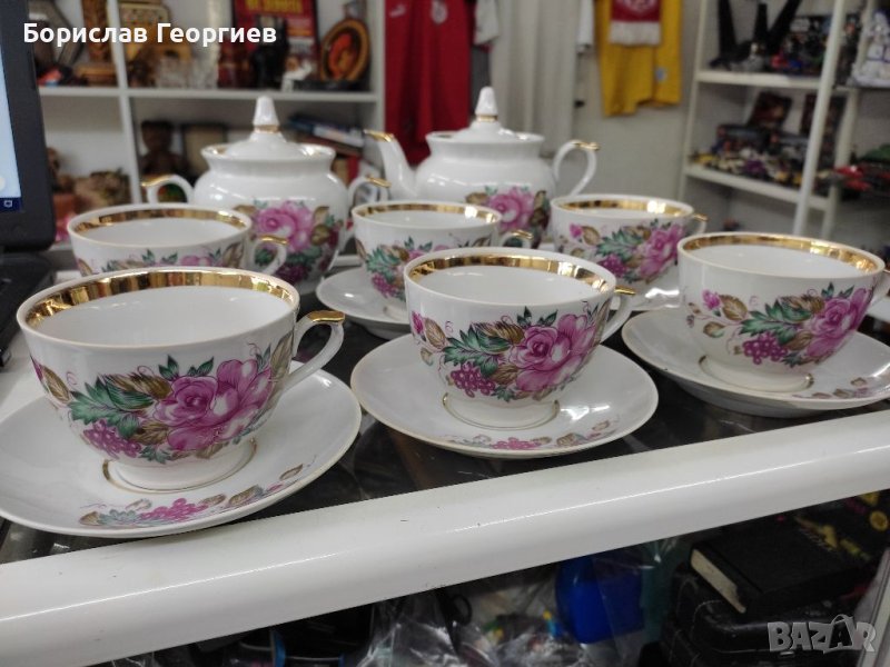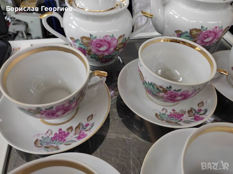 Комплекта се състои от шест чаши,шест чинии,една захарница и един чайник.Някои от съдовете има шупли от долу и някои от рисунките и позлатата имат протрити места.